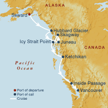 Cruise Inside Passage, Alaska Alaska's Inside Passage is awash with pristine water mountain views. A cruise among the fjords and islands takes you into prime habitat for bald eagles, sea lions, and whales. The Inside Passage is home to the totem poles of the Tlingit, Haida, and Tsimshian Indians, and Russian setters, as well as prospectors, lumberjacks, and fishermen. All have added to the tapestry of this area's history. |